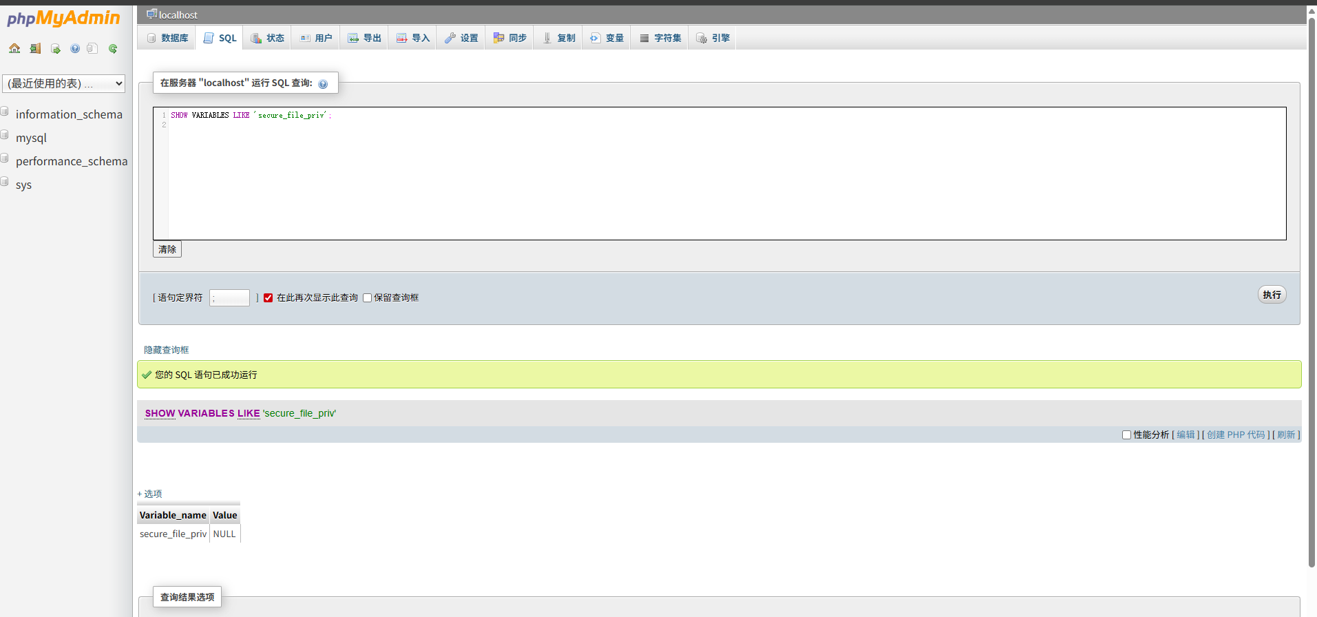 show global variables like "%secure%"; //查询secure_file_priv配置