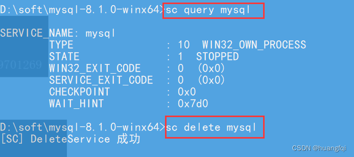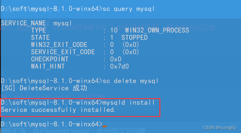 在我自认为删除的很干净的时候,执行install的时候,却提示我服务已存在,还给出了目录(实际上,这个目录已删除了),人麻了都。后来在网上找到了方法,使用sc query 可以查到,然后删除后,重新装下就可以了。