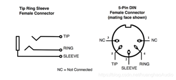 6、MIDI大5芯已经不能适应当下越做越小的电子设备,新的MIDI接口将由3.5mm耳机接口取代,最新公布的规范定义了3.5mm母座转MIDI大5芯母座的接法