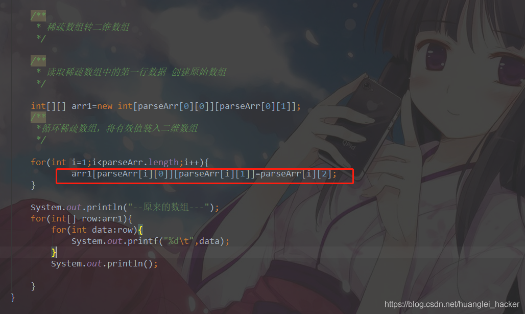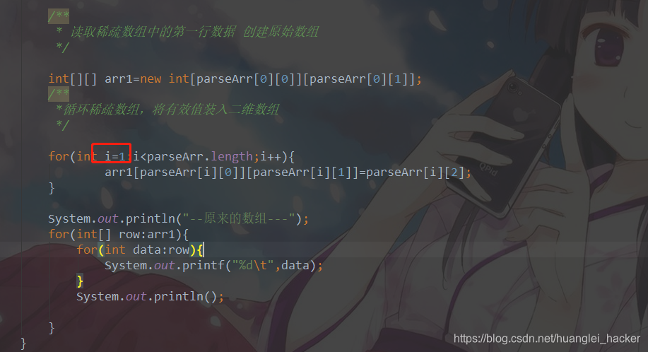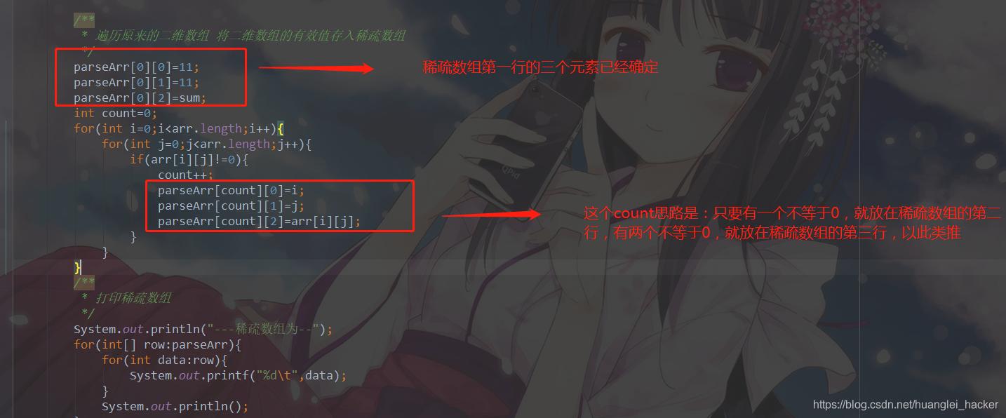 小编觉得难点在这一行,因为稀疏数组的列是固定的3列,所以只要一个for循环就能遍历完成。。。。。。