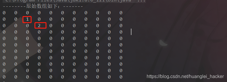 假设现在有11行11列的二维数组,其中除了二行三列和三行四列数据是有效的,其他都是0.。假设黑色的代表1,蓝色的代表2,,,
