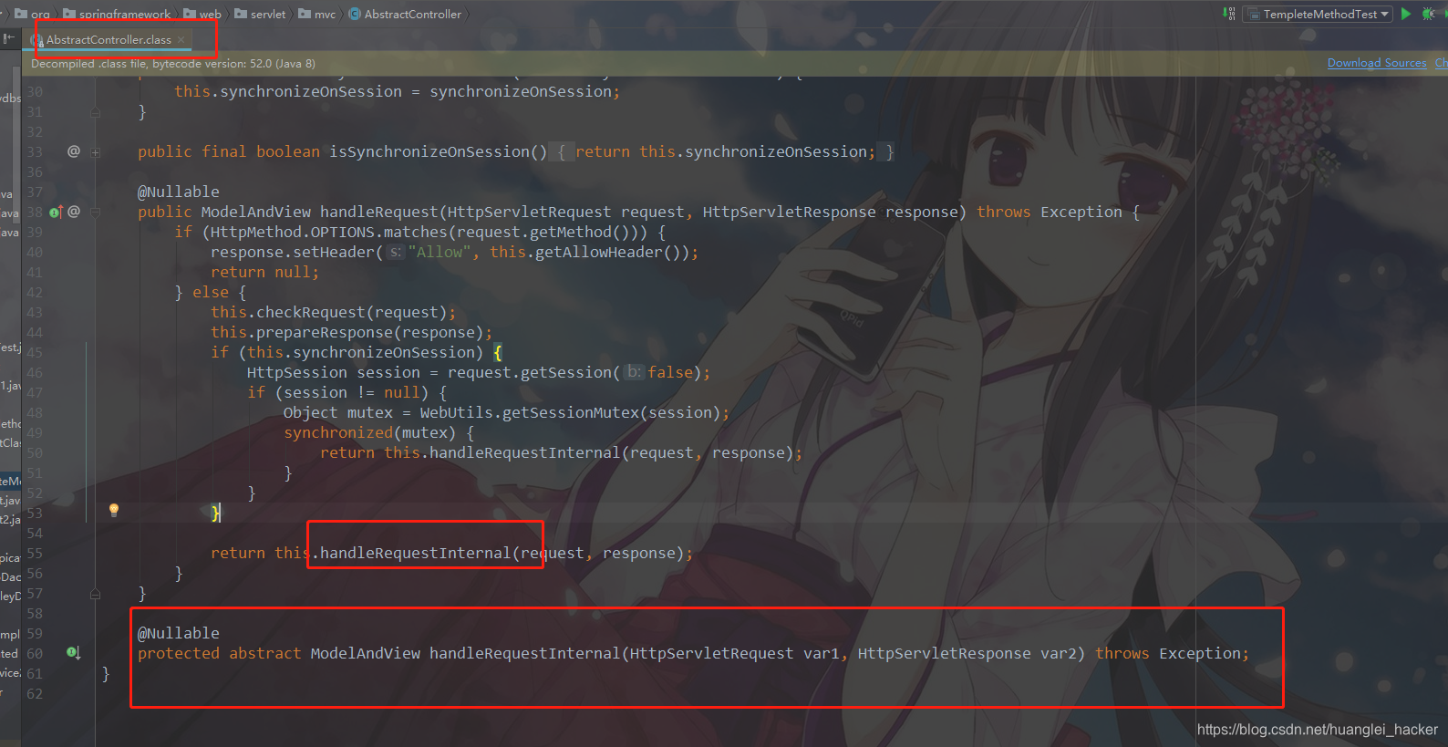 这个抽象controller 中的handleRequestInternal方法就是一个典型的模板方法,当我们继承abstractController时,需要重写这个方法,当调用handleRequest时,就会调用到我们自己重写的handleRequestInternal。。okay 这节分享就到这里。。希望对您有所帮助。。。。