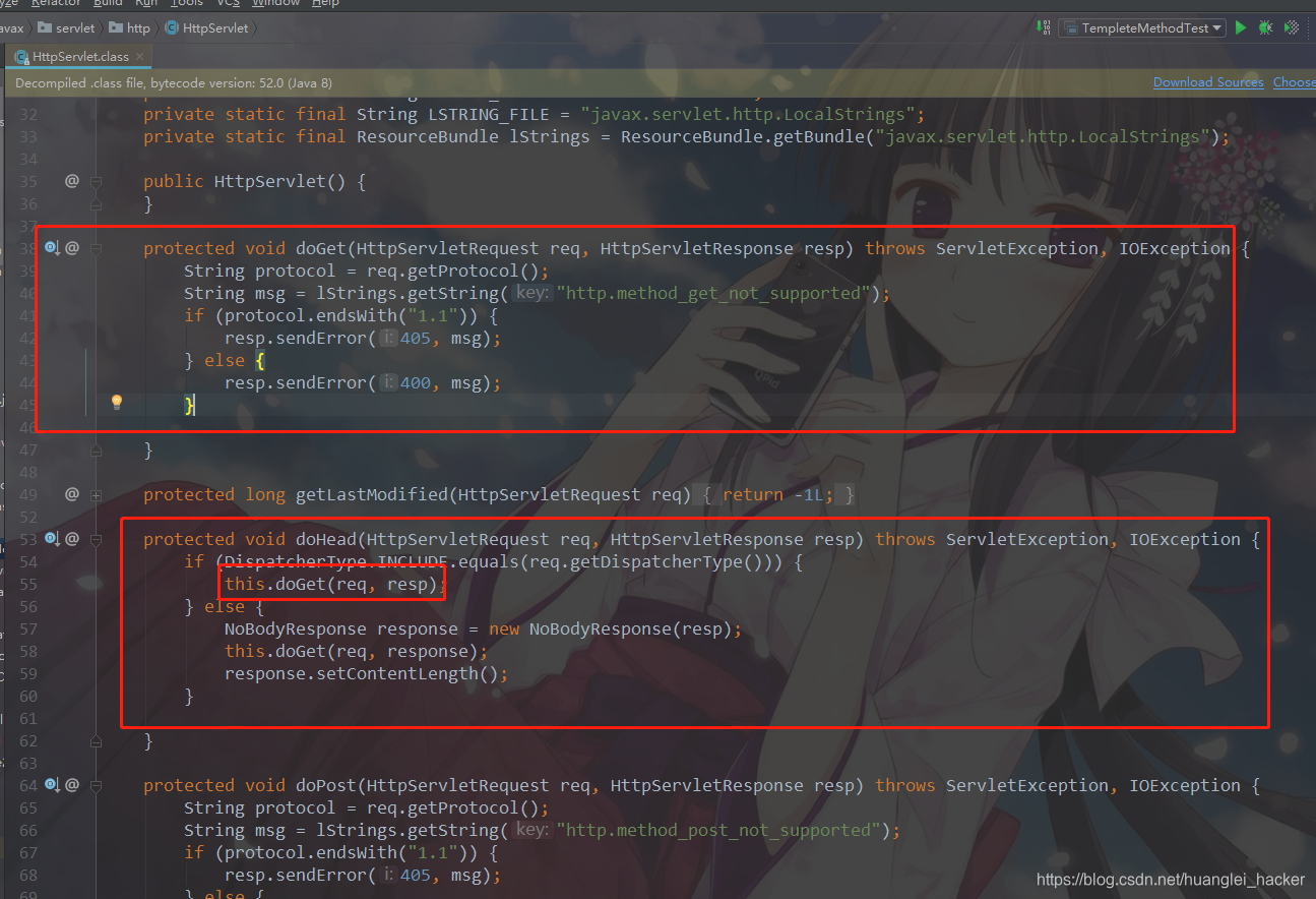 我们可以看到doGet就是模板方法。。程序员需要去实现doGet方法,当我们调用doHead 时,会调用到我们自己实现的get方法。。。接下来康康spring。。。