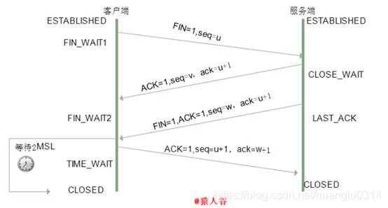 即客户端收到服务端的连接释放报文段后,对此发出确认报文段(ACK=1,seq=u+1,ack=w+1),客户端进入TIME_WAIT(时间等待)状态。此时TCP未释放掉,需要经过时间等待计时器设置的时间2MSL后,客户端才进入CLOSED状态。