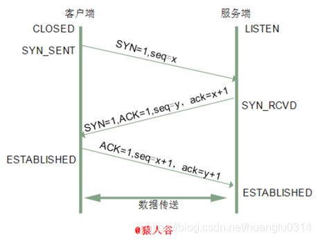 第一次握手:客户端给服务端发一个 SYN 报文,并指明客户端的初始化序列号 ISN首部的同步位SYN=1,初始序号seq=x,SYN=1的报文段不能携带数据,但要消耗掉一个序号此时客户端处于 SYN_SENT 状态
