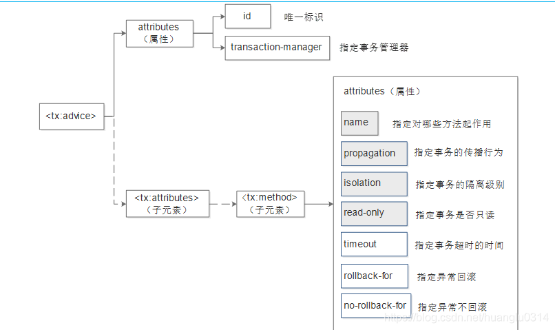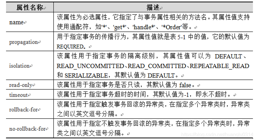 配置<tx:advice>元素的重点是配置<tx:method>子元素,上图中使用灰色标注的几个属性是<tx:method>元素中的常用属性。其属性描述具体如下