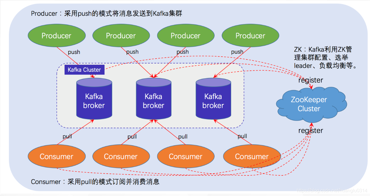 Kafka代理负责负载均衡, 假设该 Topic 有⼀个 Topic 和多个 Part, 每个分区都有⼀个 Leader,定期确认其与Zookeeper的偏移量。 因此,如果⼀个节点或代理失败,Kafka可以从Zookeeper请求的最后⼀个偏移地址继续操作, 因此Zookeeper在崩溃情况下在Kafka恢复中起着⾄关重要的作⽤