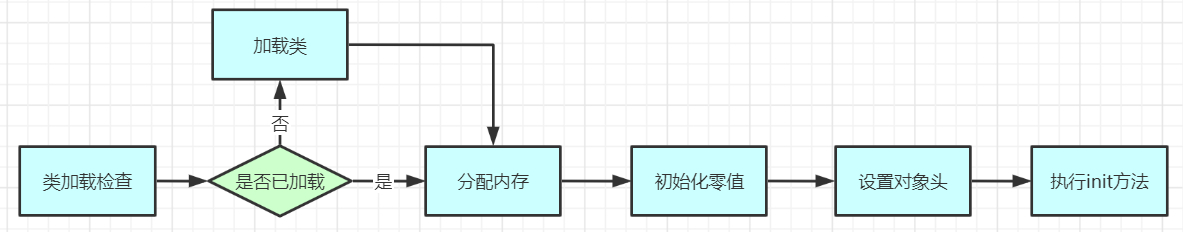 虚拟机遇到一条new指令时,首先将去检查这个指令的参数是否能在常量池中定位到一个类的符号引用,并且检查这个符号引用代表的类是否已被加载、解析和初始化过。如果没有,那必须先执行相应的类加载过程。