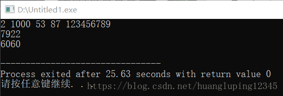 每组数据有两个数n(0 <= n < 9973)和B(1 <= B <= 10^9)。