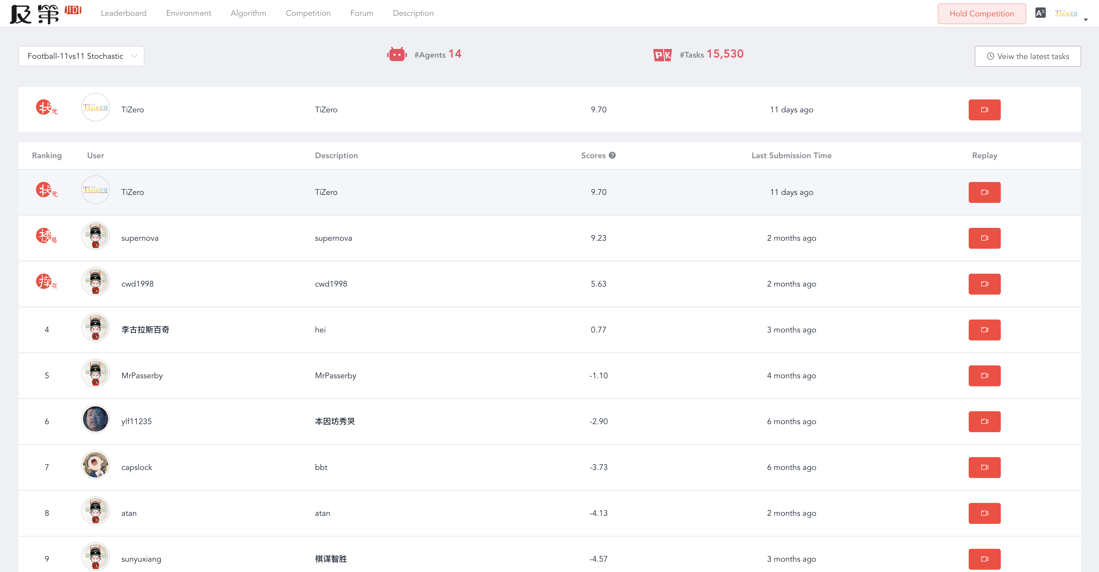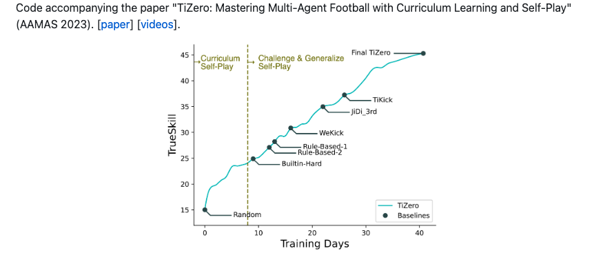 OpenRL框架是由OpenRL Lab团队开发,该团队是第四范式公司旗下的强化学习研究团队。成立不到一年,OpenRL Lab团队已经在AAMAS发表过三篇论文,参加谷歌足球游戏 11 vs 11比赛并获得第三的成绩。团队提出的TiZero智能体,实现了首个从零开始,通过课程学习、分布式强化学习、自博弈等技术完成谷歌足球全场游戏智能体的训练: