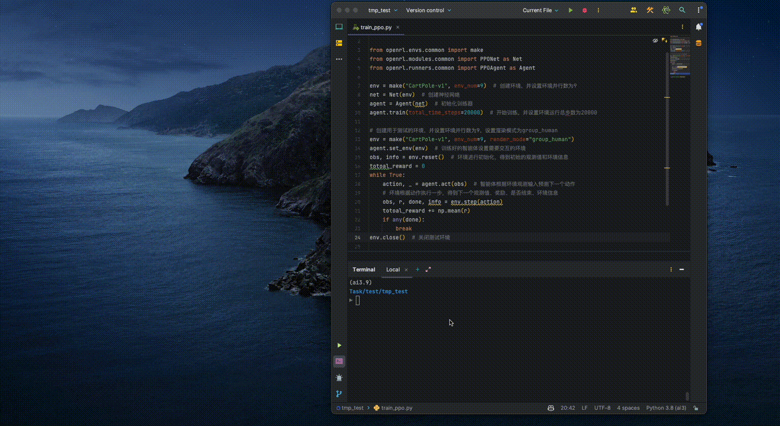 OpenRL为强化学习入门用户提供了简单易用的接口, 下面是一个使用PPO算法训练CartPole环境的例子: