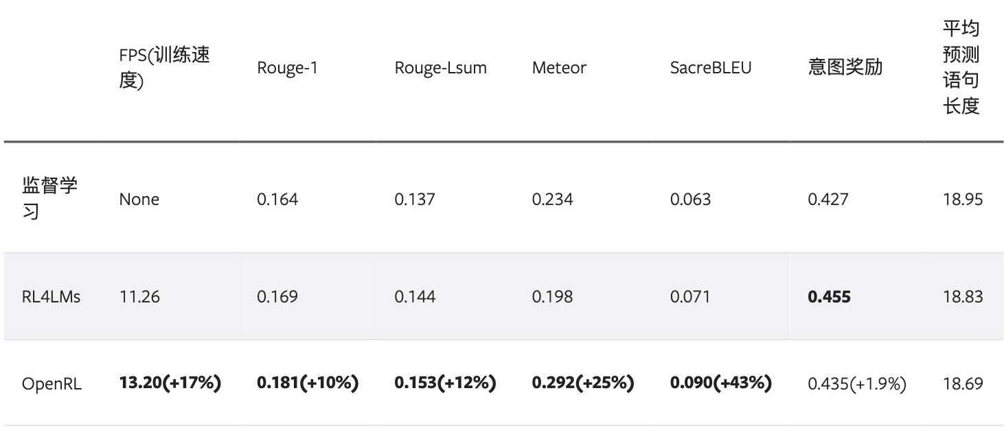 下表格展示了使用OpenRL训练该对话任务的结果。结果显示使用强化学习训练后,模型各项指标皆有所提升。 另外,从下表可以看出,相较于 RL4LMs , OpenRL的训练速度更快(在同样3090显卡的机器上,速度提升 17% ),最终的性能指标也更好: