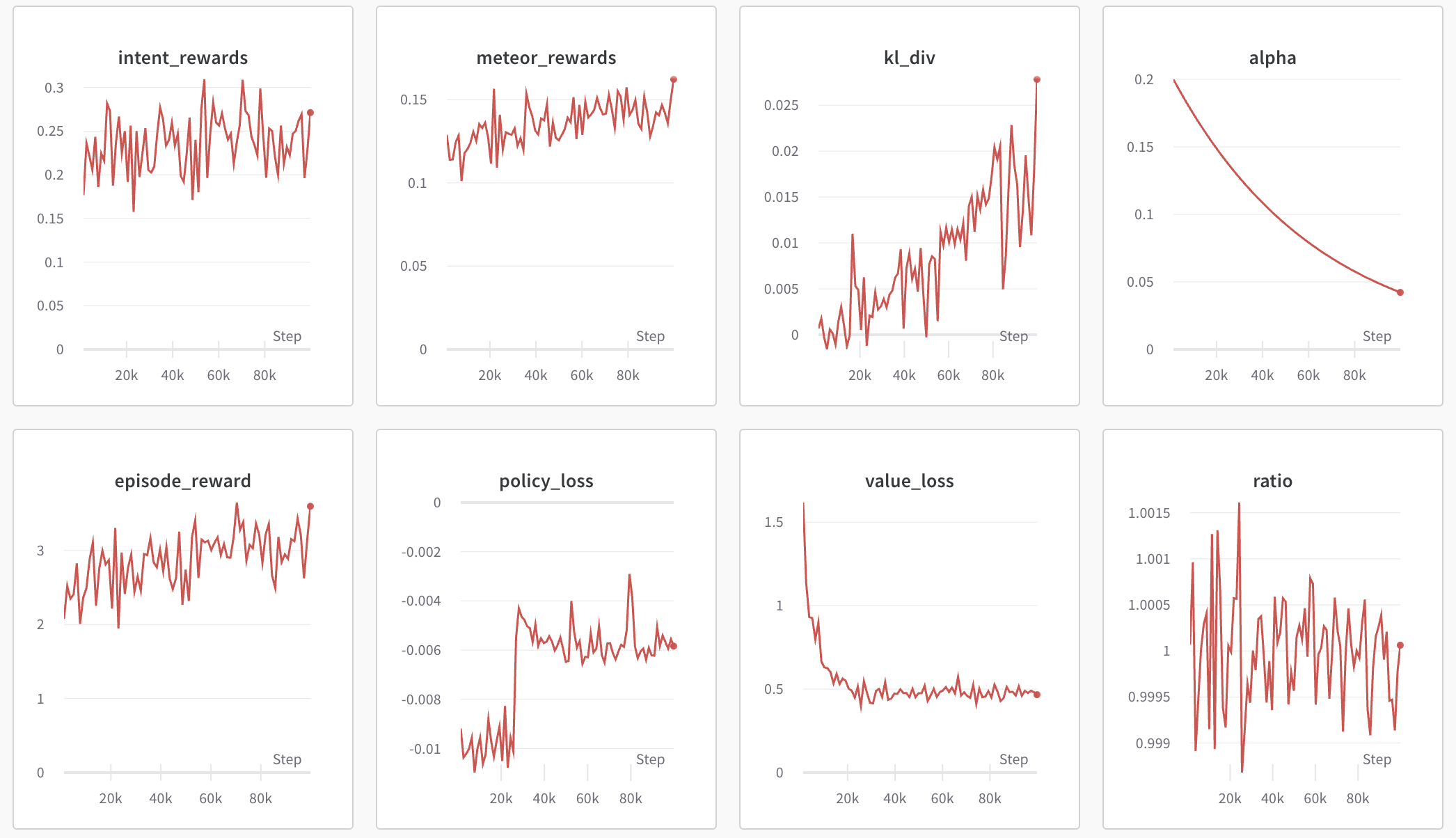 - 意图奖励:即当智能体生成的语句和期望的意图接近时,智能体便可以获得更高的奖励。