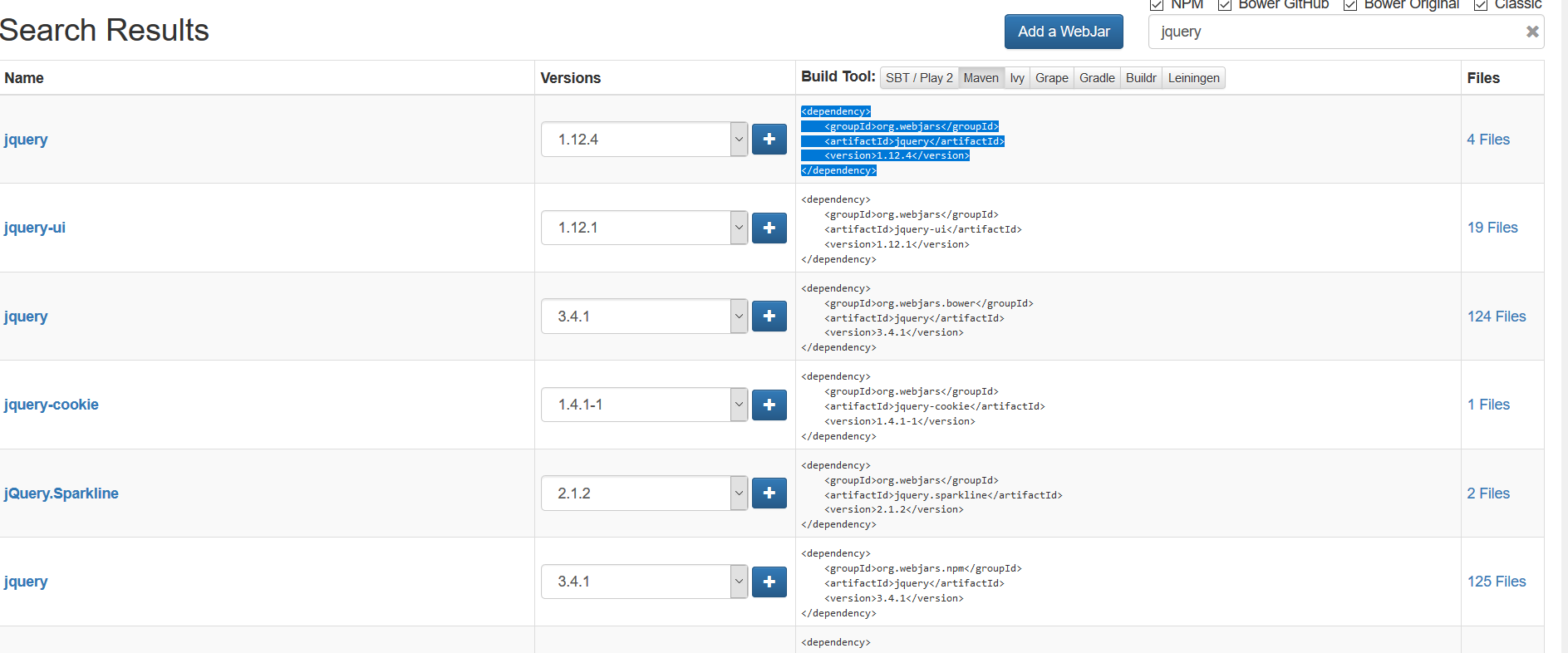 WebJars是将这些通用的Web前端资源打包成Java的Jar包,然后借助Maven工具对其管理,保证这些Web资源版本唯一性,升级也比较容易。关于webjars资源,有一个专门的网站https://www.webjars.org/,我们可以到这个网站上找到自己需要的资源,在自己的工程中添加入maven依赖,即可直接使用这些资源了。