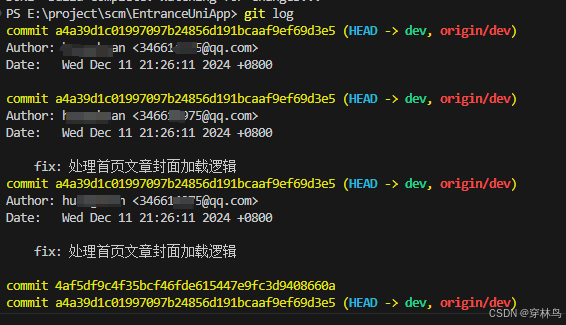 (2)使用git log命令,查看提交记录,找到需要撤回的最早的一条commit,也就是推送id,选择需要回退的节点id后按q或者:q退出