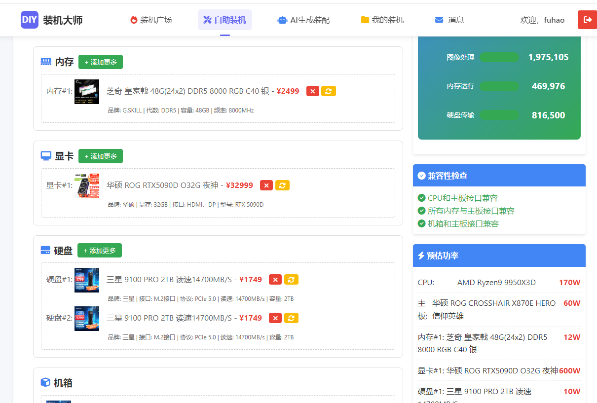 - 实时检测与反馈:当用户在网站上选择硬件组件来创建装机配置单时,系统会实时获取用户选择的硬件信息,并将这些硬件的规格参数与数据库中的兼容规则进行比对。如果发现某个硬件的规格属性不符合兼容规则,系统会立即在 UI 界面上显示不兼容的文字说明或提示,告知用户哪些硬件之间存在兼容性问题。