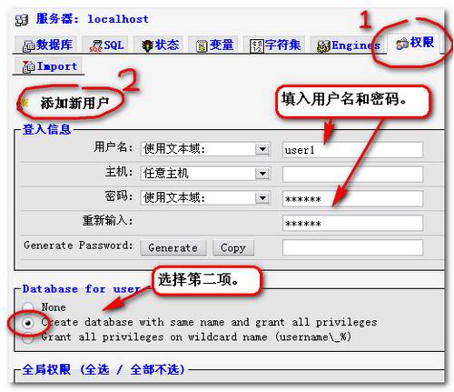 2、可能你还需要为每个虚拟主机分配 MySQL 数据库,下面介绍下如何使用 phpmyadmin 分配用户和数据库。