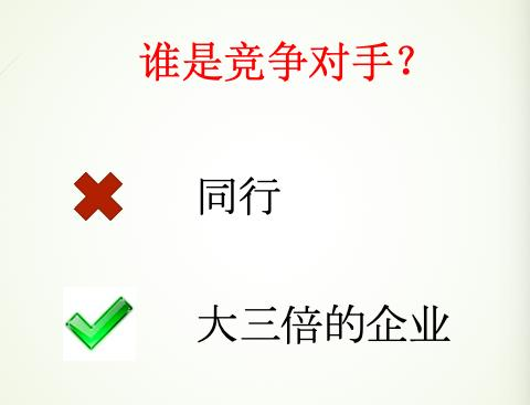 那跟自己差不多的企业是不是自己的竞争对手?如果你企业不想发展,想在原地踏步,最后被行业淘汰,那可以把他们当成对手。