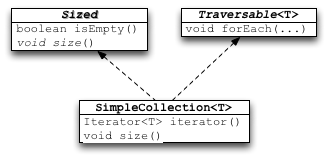 假设我们现在声明类 SimpleCollection<T>并且实现了方法 iterator和 size: