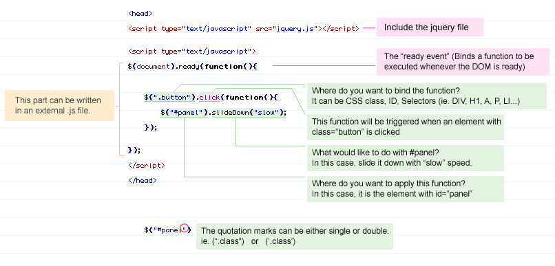 首先你需要下载jQuery库并将其插入到你的html页面中(最好是放在<head>标签内)。然后你需要调用脚本运行函数。下面的图例像你详细解释了jQuery是如何运行的。
