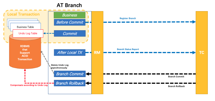 上文中我们提到的Seata流程只是Seata支持的一种分布式事务模式,称为AT模式。它依赖于RM拥有本地数据库事务的能力,对于客户业务无侵入性。如图所示: