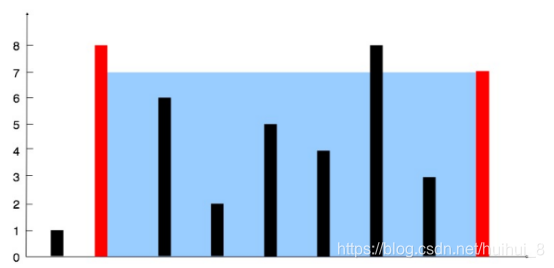 给定 n 个非负整数 a1,a2,...,an,每个数代表坐标中的一个点 (i, ai) 。在坐标内画 n 条垂直线,垂直线 i 的两个端点分别为 (i, ai) 和 (i, 0)。找出其中的两条线,使得它们与 x 轴共同构成的容器可以容纳最多的水。