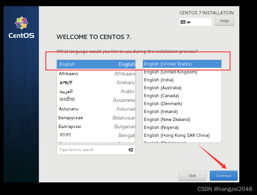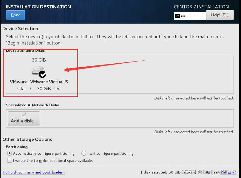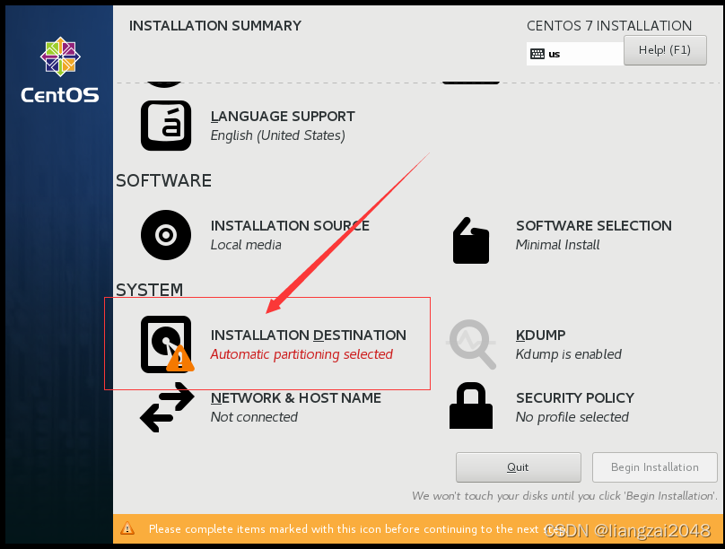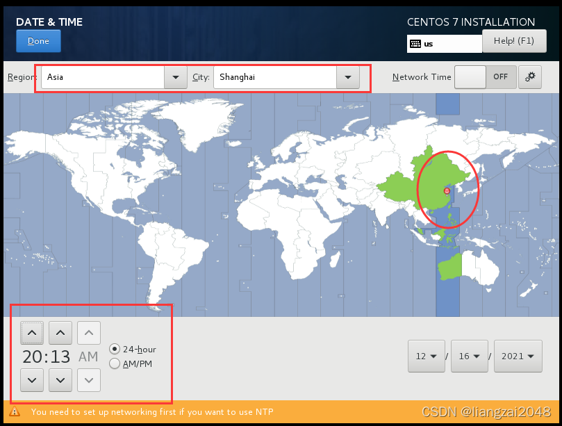 设置安装完成CenOS7 1.选择默认的English语言点击Continue 2.点击选择安装的硬盘 3.点击选择刚才创建的30GiB的虚拟存储硬盘 4.点击Done 5.点击DATE&TIME进行配置时间,选择Asia/Shanghai 6.此时可以发现时区已经被更改完毕