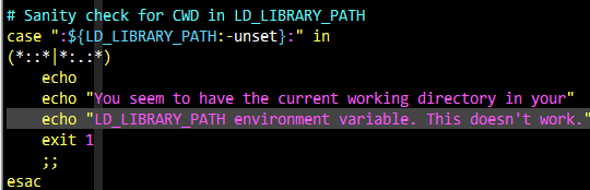 脚本写的很清楚,*::*|*:.:* ,如果你的$LD_LIBRARY_PATH包含::,那么认为有问题,直接退出。