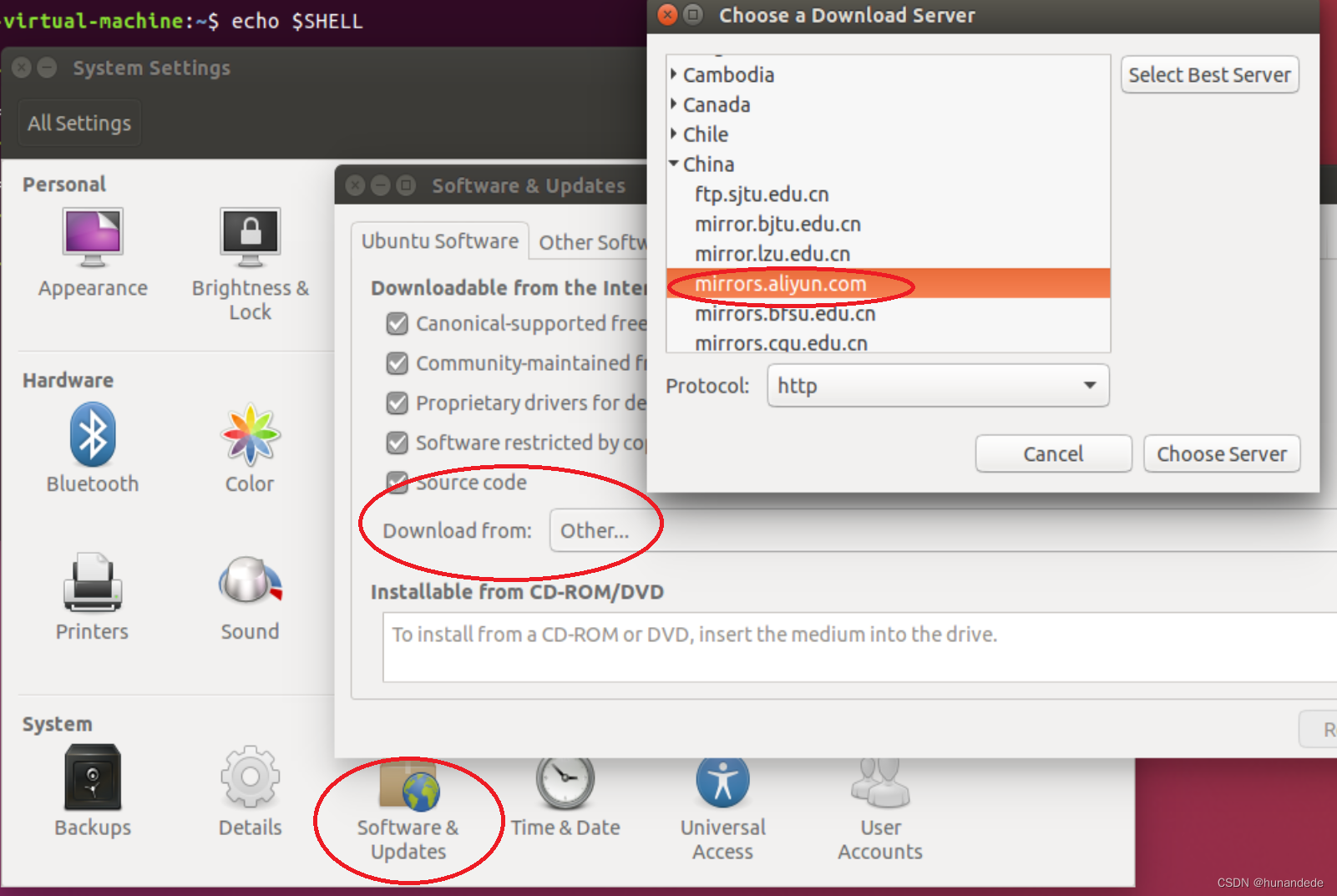 那么这里就有一个问题了, 怎么从aliyun拿,而不是163拿,甚至直接去国外的网站拿?这个要在ubutun 上设置一下,如下: