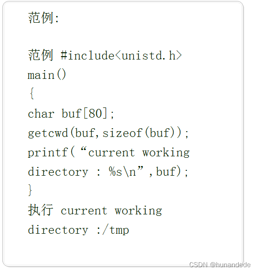 char *getcwd(char *buf, size_t size); 成功:buf中保存当前进程工作目录位置。失败返回NULL。