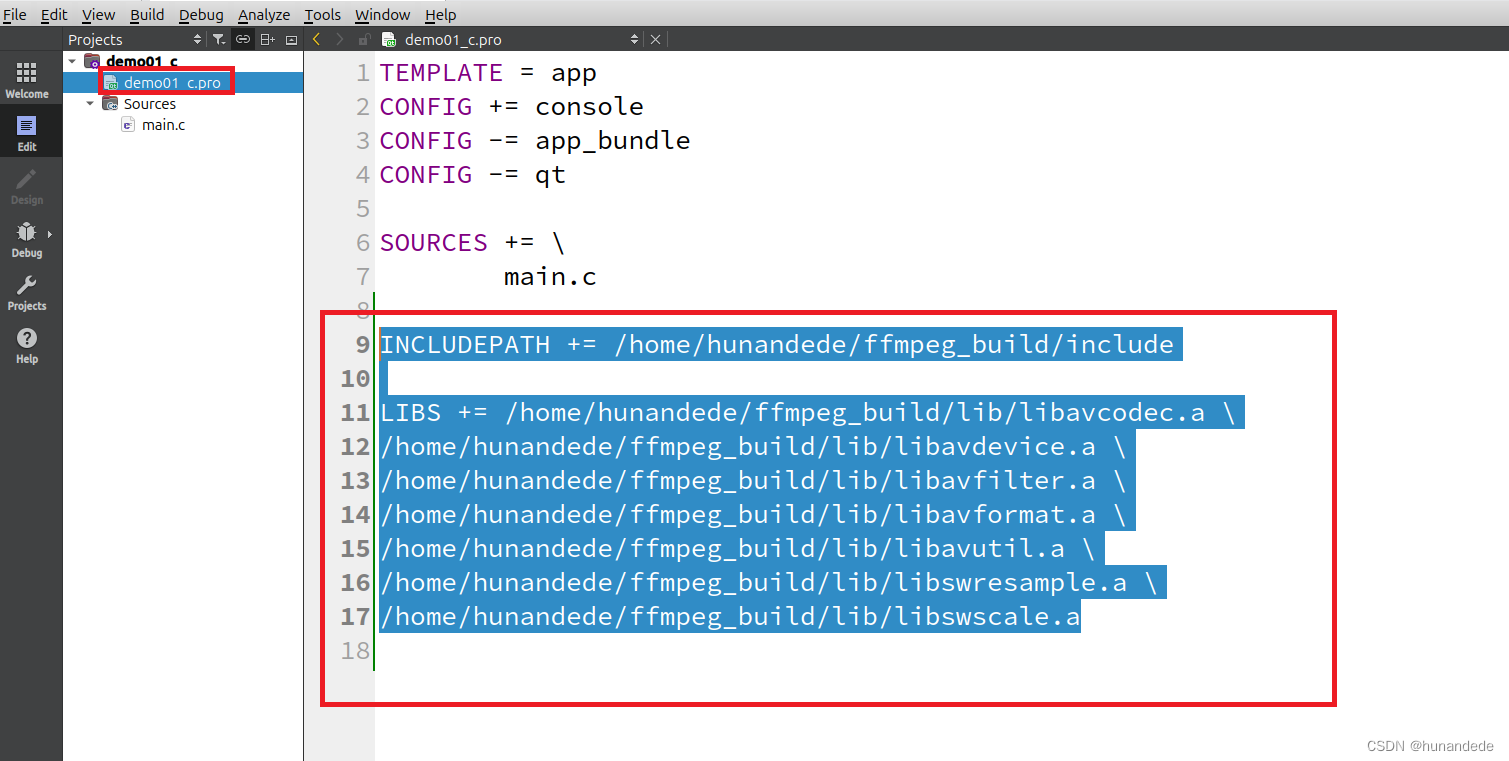 INCLUDEPATH += /home/hunandede/ffmpeg_build/include