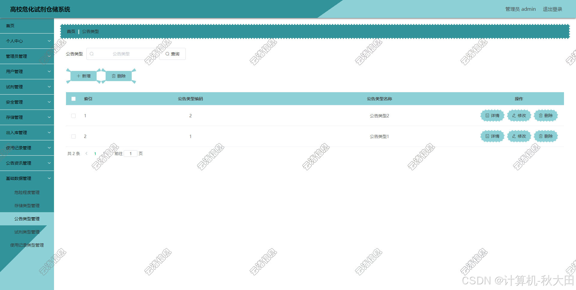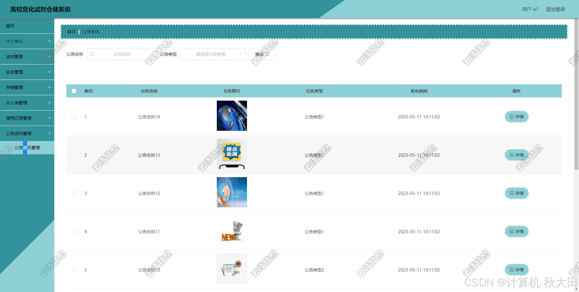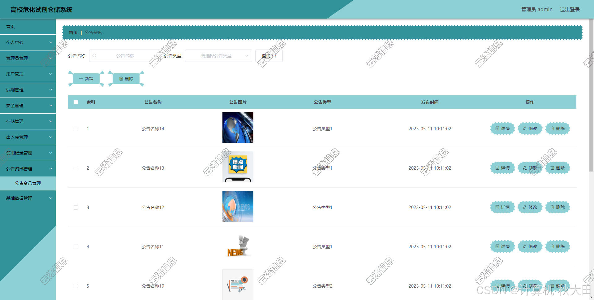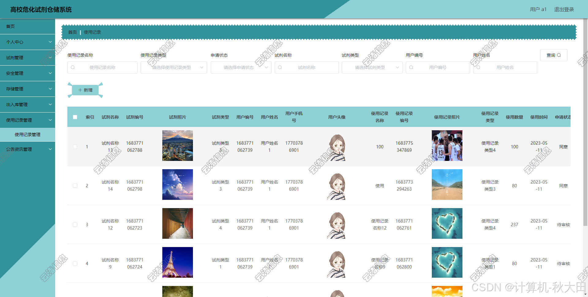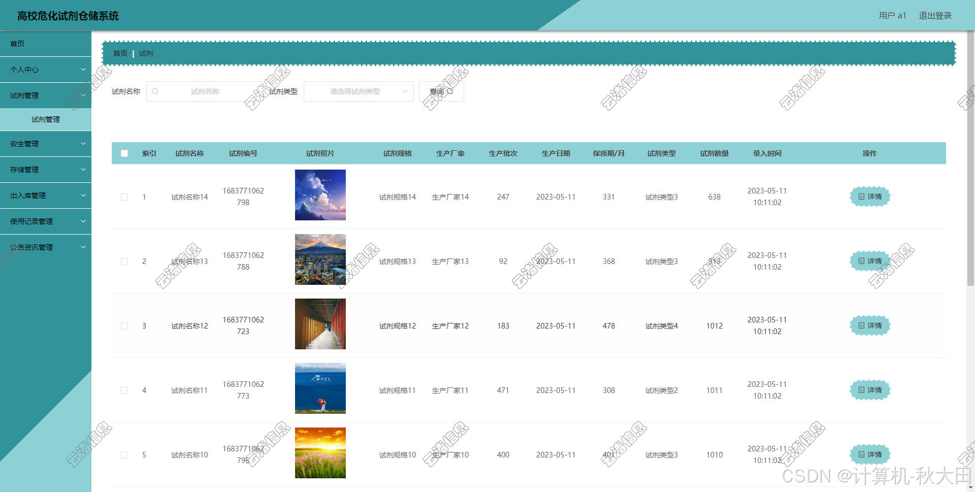 高校危化试剂仓储系统管理系统按照操作主体分为管理员和用户。管理员的功能包括安全管理、存储管理、字典管理、公告资讯管理、试剂管理、出入库管理、出入库详情管理、使用记录管理、用户管理、管理员管理。用户的功能等。该系统采用了Mysql数据库,Java语言,Spring Boot框架等技术进行编程实现。