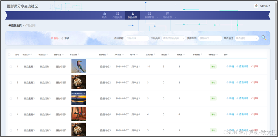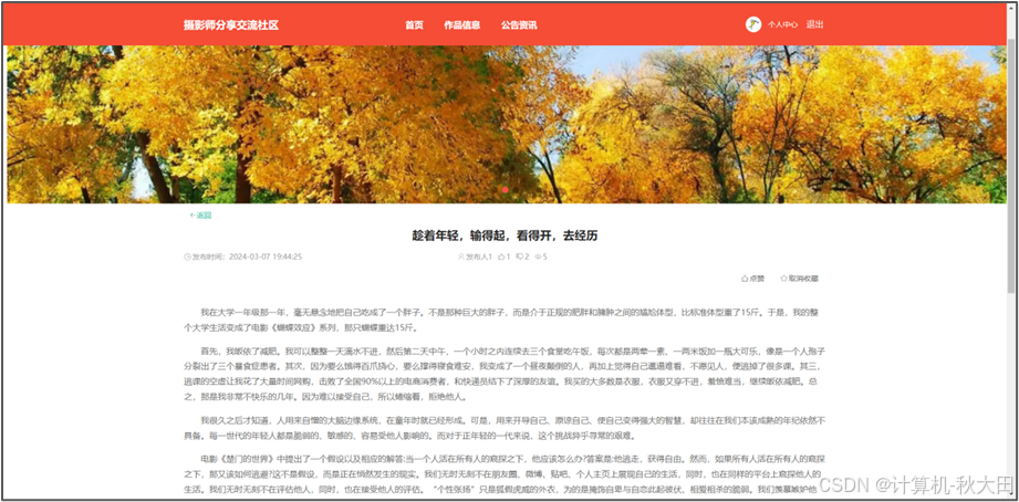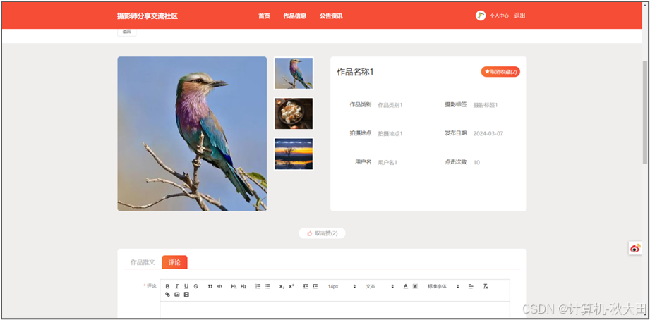 本论文旨在设计和实现一种基于Spring Boot框架的摄影师分享交流社区系统,以解决传统摄影师分享交流社区系统中存在的诸多问题。随着互联网技术的发展,传统的摄影师分享交流社区系统在功能和性能方面逐渐显现出局限性,例如用户体验不佳、系统扩展性差等。因此,本文提出了一种基于Spring Boot的解决方案,旨在提升摄影师分享交流社区系统的效率和性能,运用了Java技术,同时使用了MySQL数据库。本文首先分析了传统摄影师分享交流社区系统的特点和存在的问题,接着,提出了本系统的设计思路和系统架构。通过本文设计的基于Spring Boot的摄影师分享交流社区系统,用户可以方便地使用此操作,同时系统具有良好的性能和稳定性。实验结果表明,该系统在响应速度和并发能力方面均取得了较好的表现,满足了实际应用的需求。