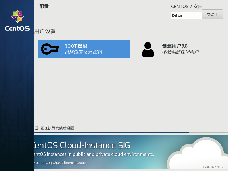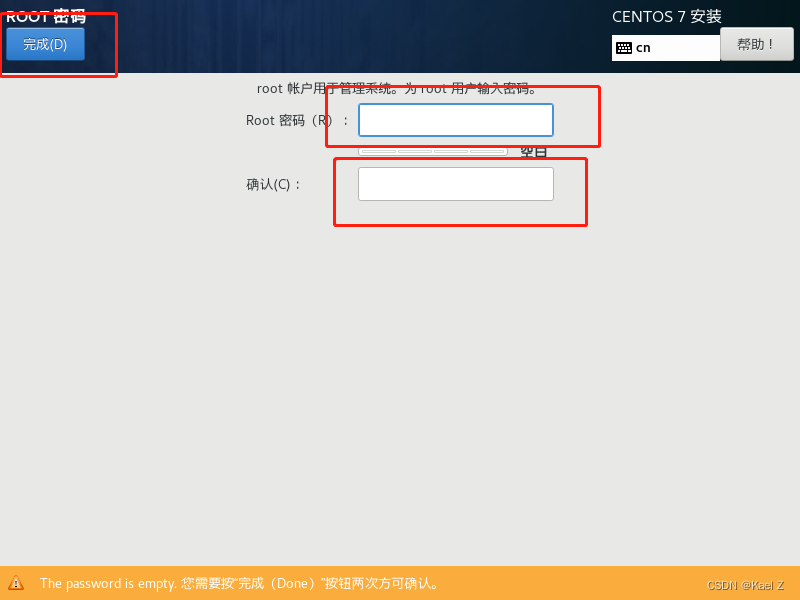 6.在弹出的窗口设置root密码,设置完成之后点击左上方的完成按钮,如果密码比较简单需要多点击一次