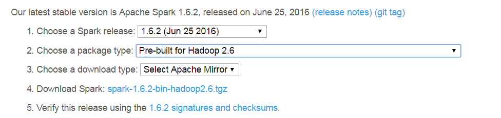 下载spark压缩包,进入链接https://spark.apache.org/downloads.html,选择当前最新版本人为1.6.2,点击下载。