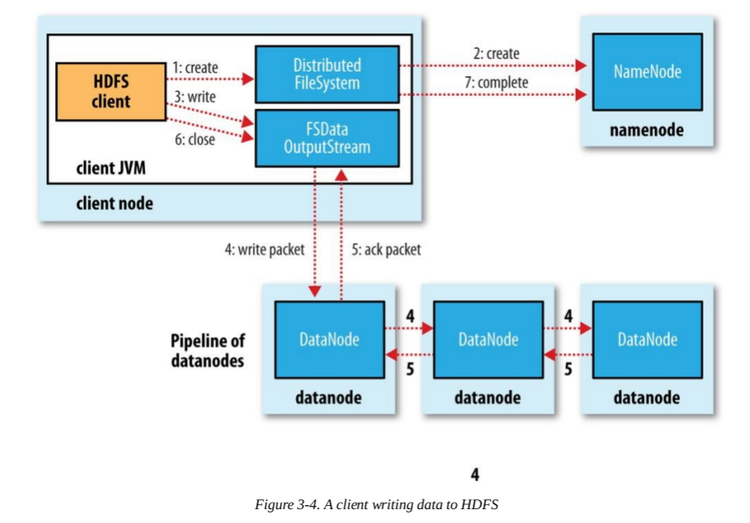 4DataStreamer 将数据包以流式传输的方式传输到分配的第一个 DataNode 中,该数据流将数据包存储到第一个 DataNode 中并将其转发到第二个 DataNode 中,接着第二个 DataNode 节点会将数据包转发到第三个 DataNode 节点;