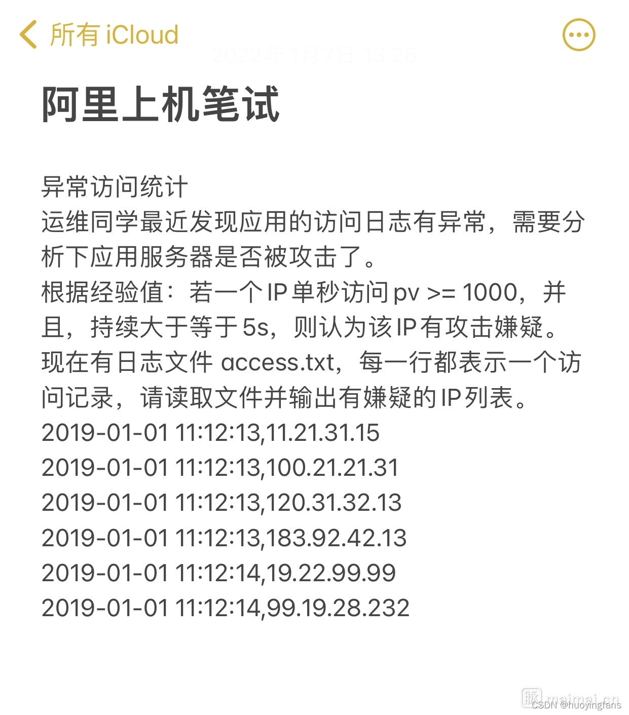 | 阿里上机笔试 异常访问统计 运维同学最近发现应用的访问日志有异常,需要分析下应用服务器是否被攻击了。 根据经验值:若一个IP单秒访问pv >= 1000,并且,持续大于等于5s,则认为该IP有攻击嫌疑。 现在有日志文件 access.txt,每一行都表示一个访问记录,请读取文件并输出有嫌疑的IP列表。 |