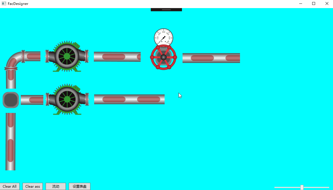 在主窗体右键添加的管道是一根水平的直管道,鼠标移动到管道的两端有半透明的拖拽区域,可以改变管道的走向和长度。要想给管道再增加一节,可以安装Ctrl键并移动鼠标,新增的管道末端会跟随鼠标移动,到达合适的位置后按下鼠标左键就会固定新增的管道。默认新增的延长管道是在初始管道的末尾,但有时需要在管道的头部新增一节管道,方法也简单,只需要将光标移动到管道的头部半透明拖拽块上并单击,半透明块会保持锁定状态,这时按Ctrl键并移动鼠标,步骤与默认方式是一样的。管道的模拟流体流速可以通过Slider连续调节。