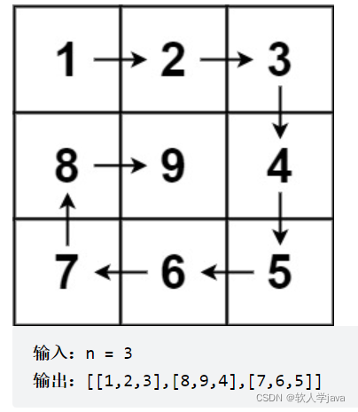 给你一个正整数 n ,生成一个包含 1 到 n2 所有元素,且元素按顺时针顺序螺旋排列的 n x n 正方形矩阵 matrix 。