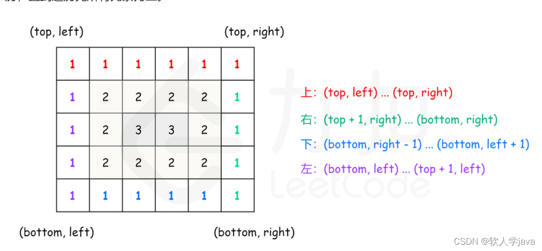 int left = 0, right = columns - 1, top = 0, bottom = rows - 1;