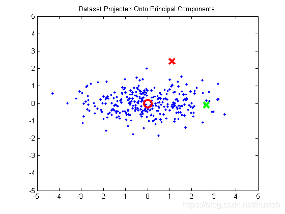 消除特征维度间的相关性后,样本分布图如下所示,还存在的一个问题是两个特征维度间的量纲不一致。