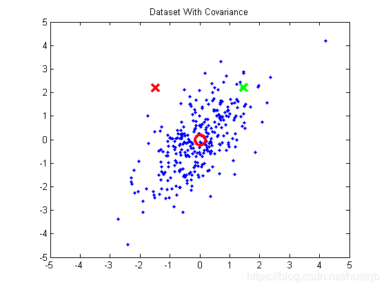 图中,圆圈表示样本分布的中心点 c c c,两个叉分别表示两个样本点 x , y x, y x,y,从图中可以看出,在二维空间中两个叉到样本分布的中心点间的欧氏距离相等。但是很明显,绿叉应该是分布内的点,红叉是分布外的点,所以绿叉距离分布中心点的距离应该更近才合理。