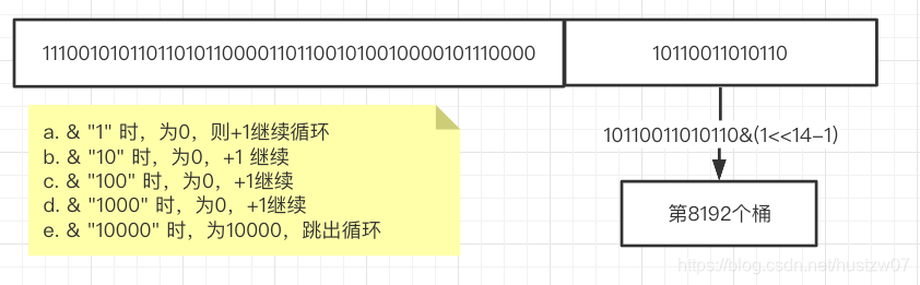 2.hash & (1<<14)-1,即取最低14位算存哪个桶