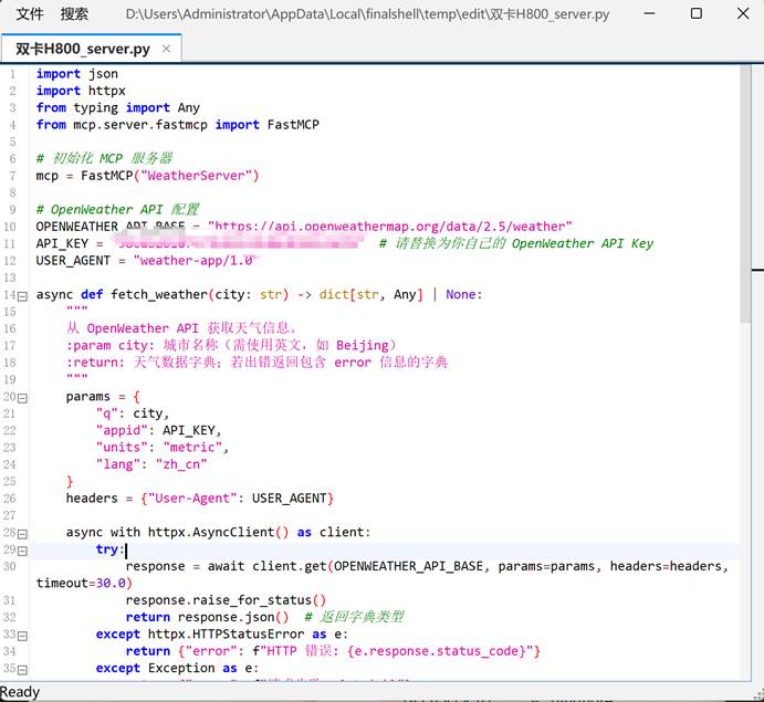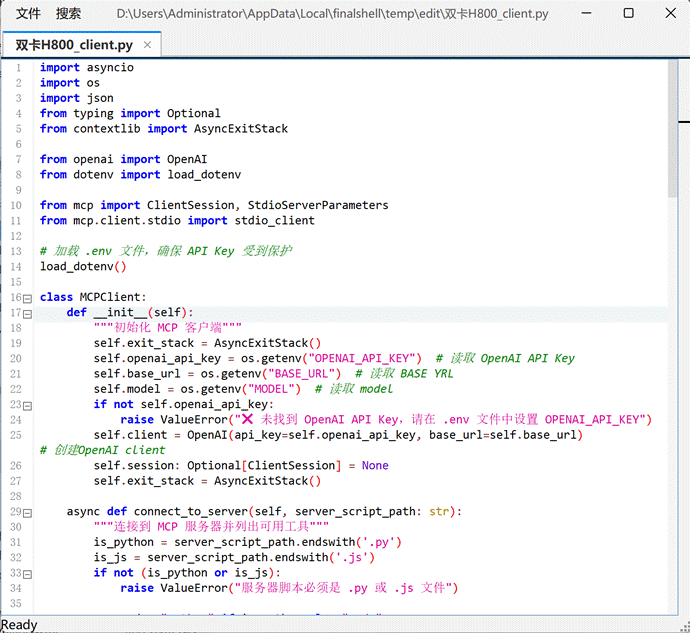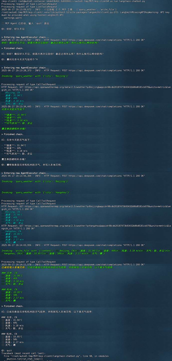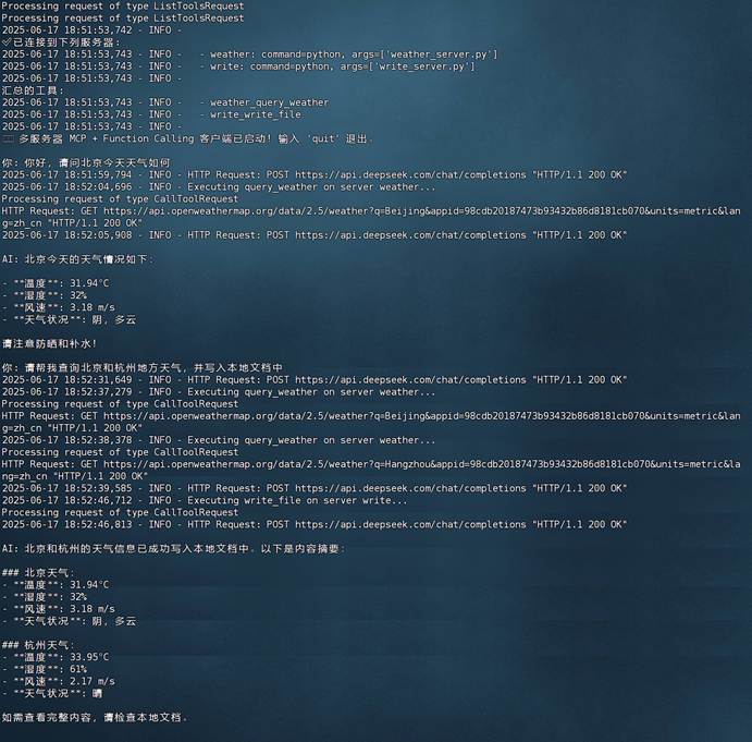 | Python import asyncio import json import logging import os import shutil from contextlib import AsyncExitStack from typing import Any, Dict, List, Optional import httpx from dotenv import load_dotenv from openai import OpenAI # OpenAI Python SDK from mcp import ClientSession, StdioServerParameters from mcp.client.stdio import stdio_client # Configure logging logging.basicConfig( level=logging.INFO, format="%(asctime)s - %(levelname)s - %(message)s" ) # ============================= # 配置加载类(支持环境变量及配置文件) # ============================= class Configuration: """管理 MCP 客户端的环境变量和配置文件""" def __init__(self) -> None: load_dotenv() # 从环境变量中加载 API key, base_url 和 model self.api_key = os.getenv("LLM_API_KEY") self.base_url = os.getenv("BASE_URL") self.model = os.getenv("MODEL") if not self.api_key: raise ValueError("❌ 未找到 LLM_API_KEY,请在 .env 文件中配置") @staticmethod def load_config(file_path: str) -> Dict[str, Any]: """ 从 JSON 文件加载服务器配置 Args: file_path: JSON 配置文件路径 Returns: 包含服务器配置的字典 """ with open(file_path, "r") as f: return json.load(f) # ============================= # MCP 服务器客户端类 # ============================= class Server: """管理单个 MCP 服务器连接和工具调用""" def __init__(self, name: str, config: Dict[str, Any]) -> None: self.name: str = name self.config: Dict[str, Any] = config self.session: Optional[ClientSession] = None self.exit_stack: AsyncExitStack = AsyncExitStack() self._cleanup_lock = asyncio.Lock() async def initialize(self) -> None: """初始化与 MCP 服务器的连接""" # command 字段直接从配置获取 command = self.config["command"] if command is None: raise ValueError("command 不能为空") server_params = StdioServerParameters( command=command, args=self.config["args"], env={**os.environ, **self.config["env"]} if self.config.get("env") else None, ) try: stdio_transport = await self.exit_stack.enter_async_context( stdio_client(server_params) ) read_stream, write_stream = stdio_transport session = await self.exit_stack.enter_async_context( ClientSession(read_stream, write_stream) ) await session.initialize() self.session = session except Exception as e: logging.error(f"Error initializing server {self.name}: {e}") await self.cleanup() raise async def list_tools(self) -> List[Any]: """获取服务器可用的工具列表 Returns: 工具列表 """ if not self.session: raise RuntimeError(f"Server {self.name} not initialized") tools_response = await self.session.list_tools() tools = [] for item in tools_response: if isinstance(item, tuple) and item[0] == "tools": for tool in item[1]: tools.append(Tool(tool.name, tool.description, tool.inputSchema)) return tools async def execute_tool( self, tool_name: str, arguments: Dict[str, Any], retries: int = 2, delay: float = 1.0 ) -> Any: """执行指定工具,并支持重试机制 Args: tool_name: 工具名称 arguments: 工具参数 retries: 重试次数 delay: 重试间隔秒数 Returns: 工具调用结果 """ if not self.session: raise RuntimeError(f"Server {self.name} not initialized") attempt = 0 while attempt < retries: try: logging.info(f"Executing {tool_name} on server {self.name}...") result = await self.session.call_tool(tool_name, arguments) return result except Exception as e: attempt += 1 logging.warning( f"Error executing tool: {e}. Attempt {attempt} of {retries}." ) if attempt < retries: logging.info(f"Retrying in {delay} seconds...") await asyncio.sleep(delay) else: logging.error("Max retries reached. Failing.") raise async def cleanup(self) -> None: """清理服务器资源""" async with self._cleanup_lock: try: await self.exit_stack.aclose() self.session = None except Exception as e: logging.error(f"Error during cleanup of server {self.name}: {e}") # ============================= # 工具封装类 # ============================= class Tool: """封装 MCP 返回的工具信息""" def __init__(self, name: str, description: str, input_schema: Dict[str, Any]) -> None: self.name: str = name self.description: str = description self.input_schema: Dict[str, Any] = input_schema def format_for_llm(self) -> str: """生成用于 LLM 提示的工具描述""" args_desc = [] if "properties" in self.input_schema: for param_name, param_info in self.input_schema["properties"].items(): arg_desc = f"- {param_name}: {param_info.get('description', 'No description')}" if param_name in self.input_schema.get("required", []): arg_desc += " (required)" args_desc.append(arg_desc) return f""" Tool: {self.name} Description: {self.description} Arguments: {chr(10).join(args_desc)} """ # ============================= # LLM 客户端封装类(使用 OpenAI SDK) # ============================= class LLMClient: """使用 OpenAI SDK 与大模型交互""" def __init__(self, api_key: str, base_url: Optional[str], model: str) -> None: self.client = OpenAI(api_key=api_key, base_url=base_url) self.model = model def get_response(self, messages: List[Dict[str, Any]], tools: Optional[List[Dict[str, Any]]] = None) -> Any: """ 发送消息给大模型 API,支持传入工具参数(function calling 格式) """ payload = { "model": self.model, "messages": messages, "tools": tools, } try: response = self.client.chat.completions.create(**payload) return response except Exception as e: logging.error(f"Error during LLM call: {e}") raise # ============================= # 多服务器 MCP 客户端类(集成配置文件、工具格式转换与 OpenAI SDK 调用) # ============================= class MultiServerMCPClient: def __init__(self) -> None: """ 管理多个 MCP 服务器,并使用 OpenAI Function Calling 风格的接口调用大模型 """ self.exit_stack = AsyncExitStack() config = Configuration() self.openai_api_key = config.api_key self.base_url = config.base_url self.model = config.model self.client = LLMClient(self.openai_api_key, self.base_url, self.model) # (server_name -> Ser
