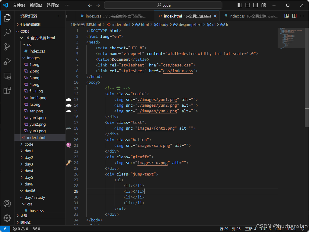 结束,这次还是非常简单的,没有啥需要注意的,主要是因为知识点需要记的比较多,前面所学的内容很容易忘,还得不断巩固。这次使用的有子绝父相position,动画animation,位移transform,margin外边距等。