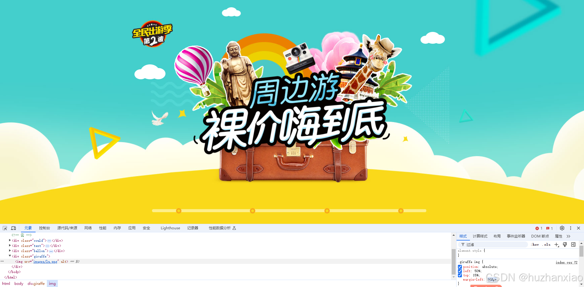 我们首先先做热气球和长颈鹿,我们发现它其实是压在文字图片周围的,我们这时就需要加入position,我们还是将图片调整至中间然后去网页中进行调整测试