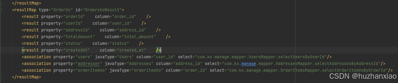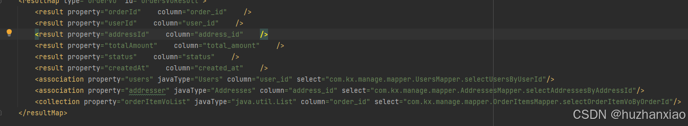 这个是我ordermapper,用来进行数据库操作,因为这段我是按照我之前学的项目来仿造进行编写的,我对这个的使用不是很熟悉,所以我直接询问了ai,ai告诉我,association是只返回一个内容的标签,而我需要使用collection才能返回多行标签。